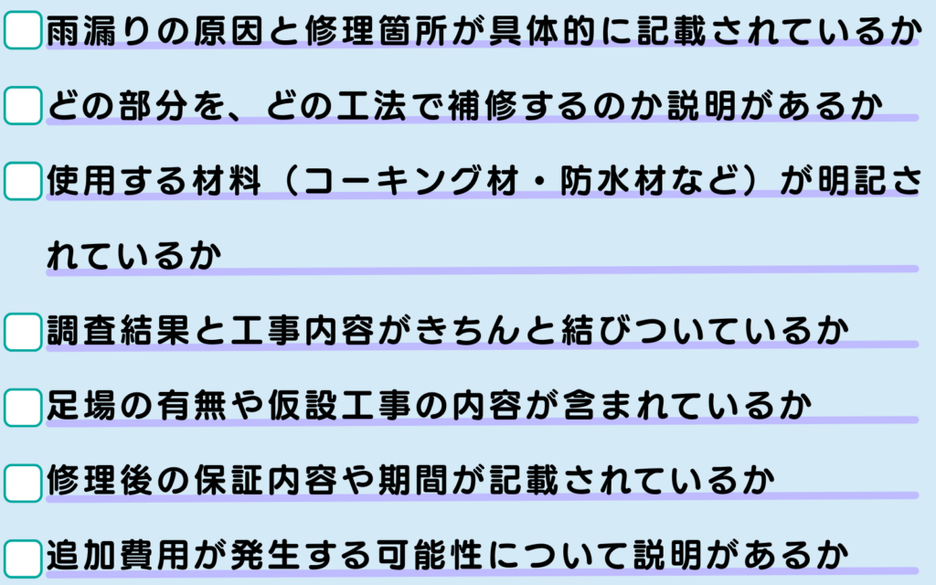 見積もりは金額だけで判断するのではなく、調査内容や修理範囲まで含めて比較することが大切です。