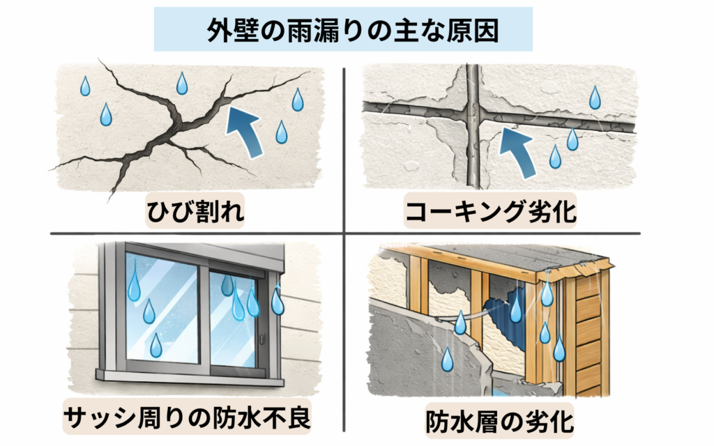 第1章でも触れた通り、外壁の雨漏りは原因が一つとは限らず、見た目の症状と実際の侵入経路が一致しないケースも多くあります。