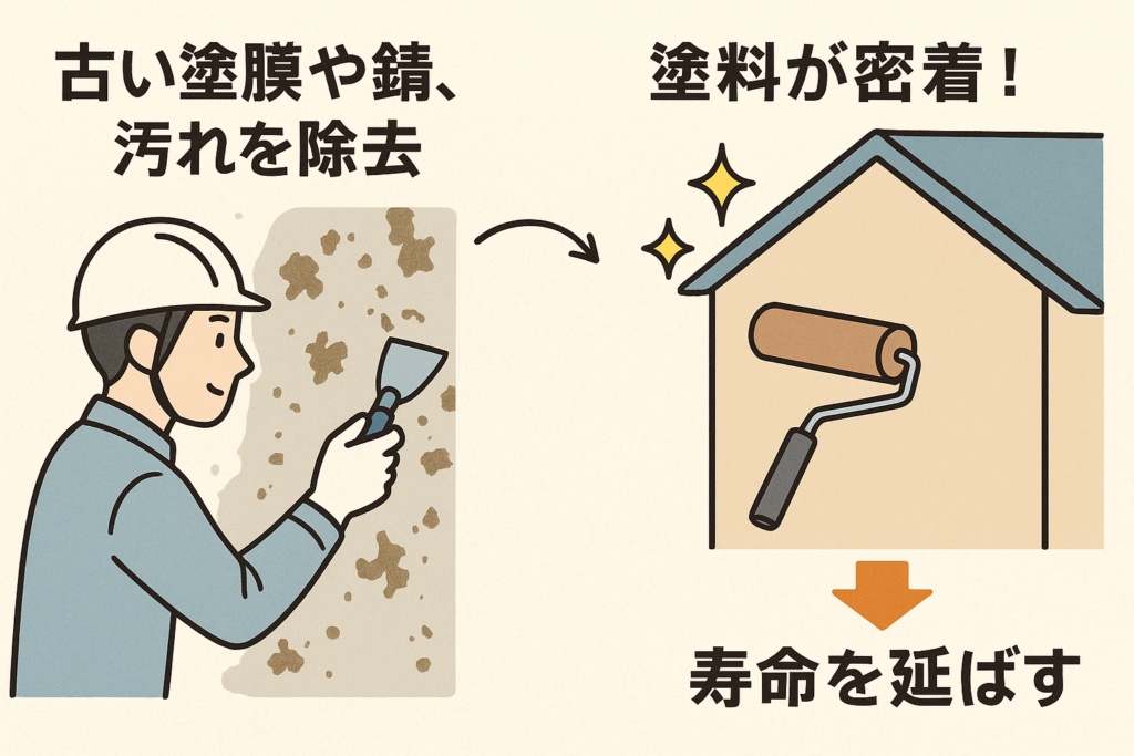 外壁や屋根の塗装において、ケレン処理は単なる下地清掃ではなく、その後の耐久性を決定づける最も重要な工程です。