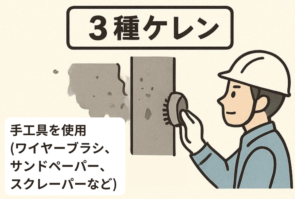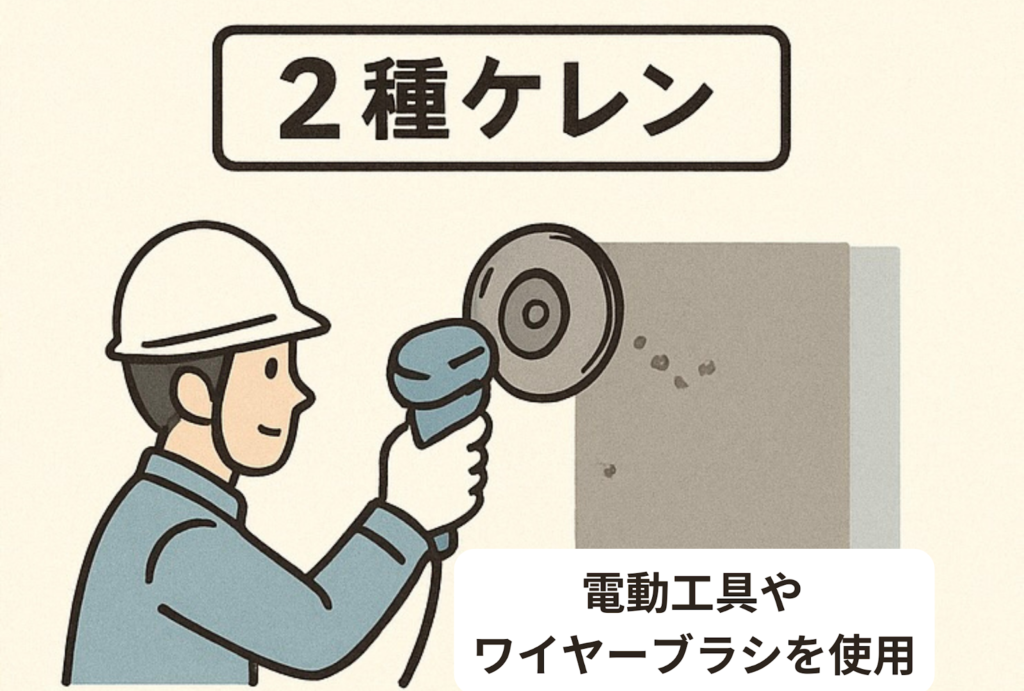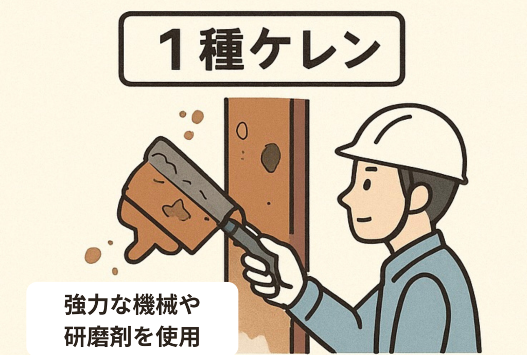 ケレンにはいくつかの種類があり、それぞれの特徴を理解することが重要です。この作業は、劣化の度合いや目的によって「1種から4種」に分類され、数字が小さいほど強力で徹底的な下地処理となります。