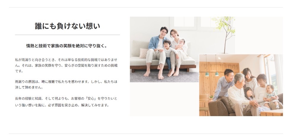 雨漏り診断士として、長年培ってきた豊富な経験と技術で、皆さまの不安を解消します。複雑な原因を正確に見抜き、雨漏りを根本から解決することで、お客様の大切なお住まいと笑顔を守ります。