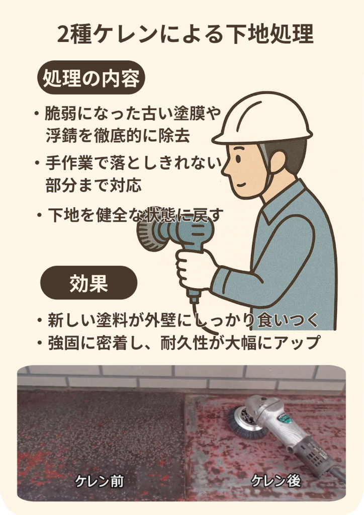 外壁塗装の品質は、下地処理で決まると言っても過言ではありません。その中でも、2種ケレンは、外壁の耐久性を根本から向上させるための鍵となります。