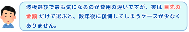 数年ごとにこれらの諸経費を払い続けることを考えれば、初期投資が少し高くても長持ちする素材を選ぶ方が、最終的な支出を大幅に抑えることができます。