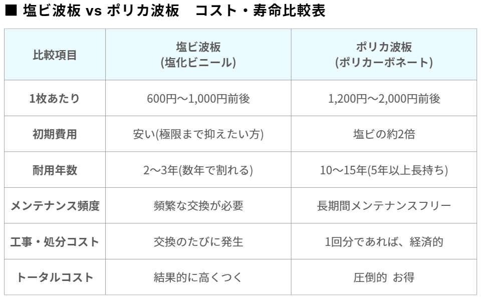 波板選びは、「安いか高いか」だけで決めてしまうと、後から後悔しやすいポイントです。塩ビ波板とポリカ波板には、それぞれ向いている使い方があります。