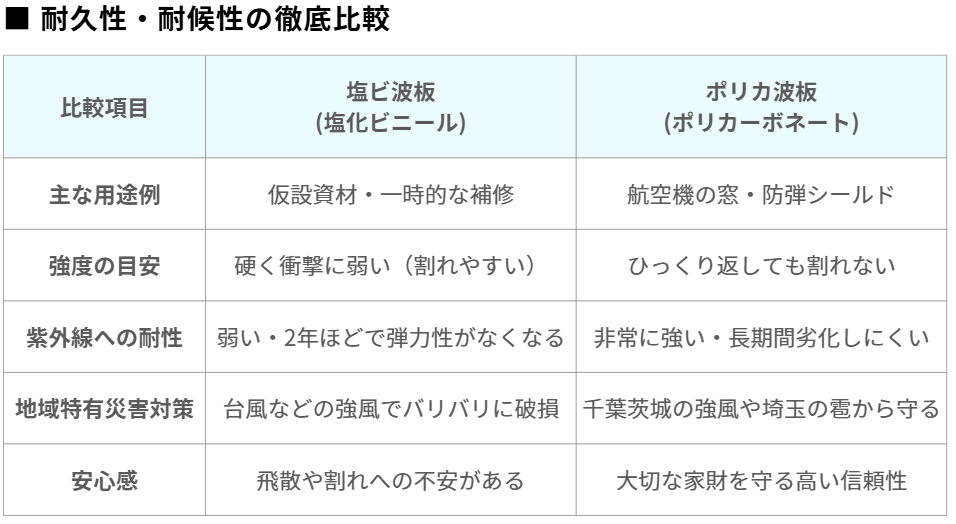 特に千葉県・茨城県沿岸部、埼玉県の開けた住宅地では、風と紫外線のダメージが想像以上に大きいため、「最初からポリカにしておけばよかった」というお声をよく聞きます。