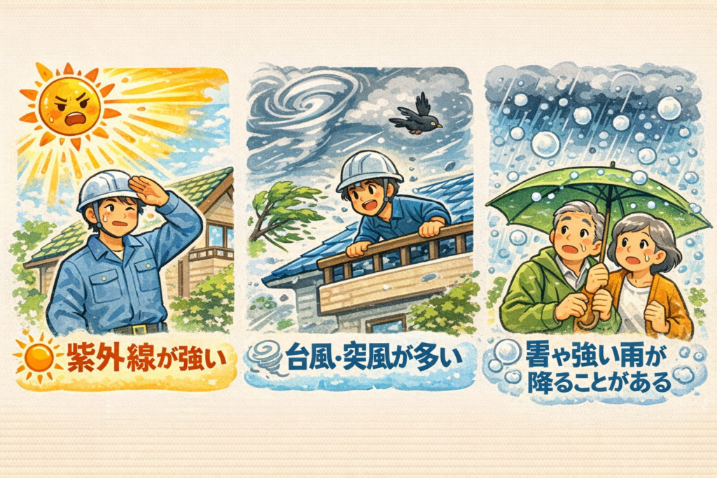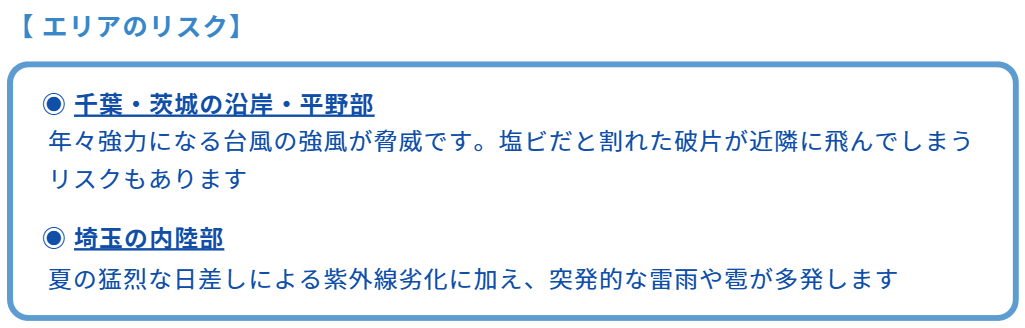 特に千葉県・埼玉県・茨城県のように、日差しが強く、台風や突風の影響を受けやすい地域では「今だけ」ではなく、「これから先」を見据えた選択が大切になります。
