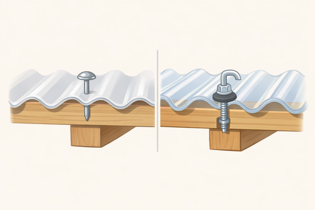 波板本体が丈夫でも、それを固定する「留め具」が先にダメになっては意味がありません。下地の素材に合わせて最適なものを選びます。