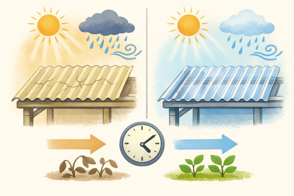 👉 塩ビ波板は、3〜5年ほどで割れ・白濁・反りが出やすいのが現実です。