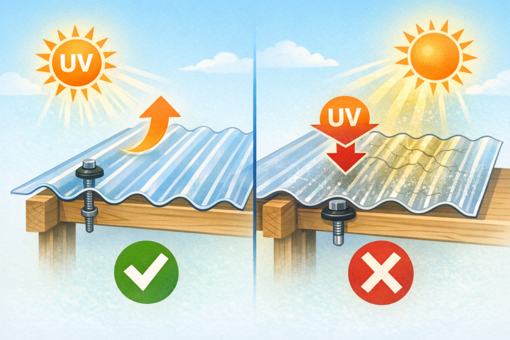 ここが最も重要なポイントです。ポリカ波板の多くは、片面だけに特殊なUVカットコーティングが施されています。