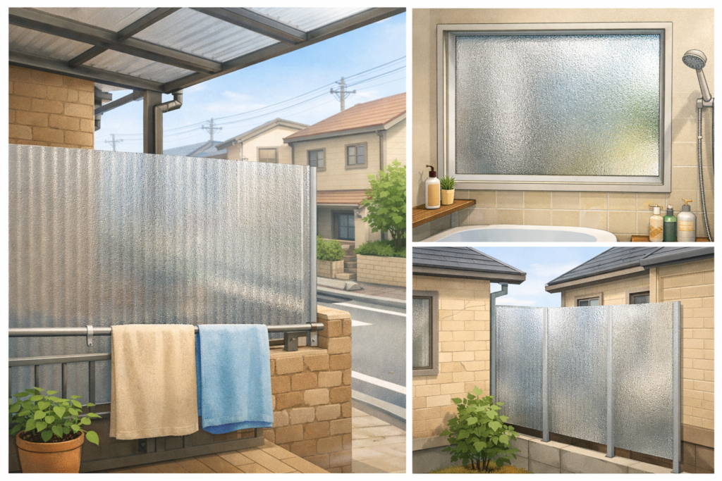 通りに面したベランダ、浴室の目隠し、隣家との距離が近い場所