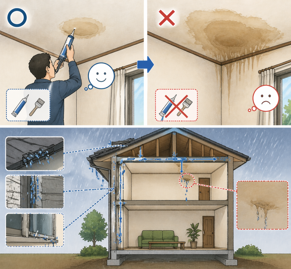 シミの周辺や気になる箇所に材料を塗ることで一時的に安心感は得られますが、雨漏りの原因はその場所にあるとは限りません。