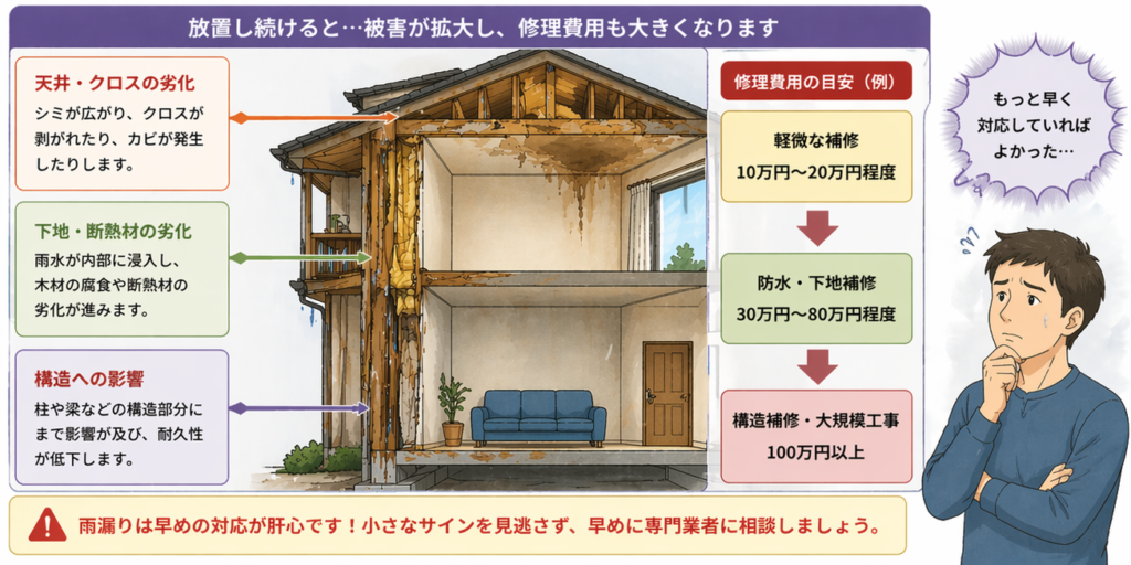 雨漏りは、早い段階であれば小さな補修で済む一方、判断が遅れるほど工事は大きくなり、費用も大きくなっていきます。