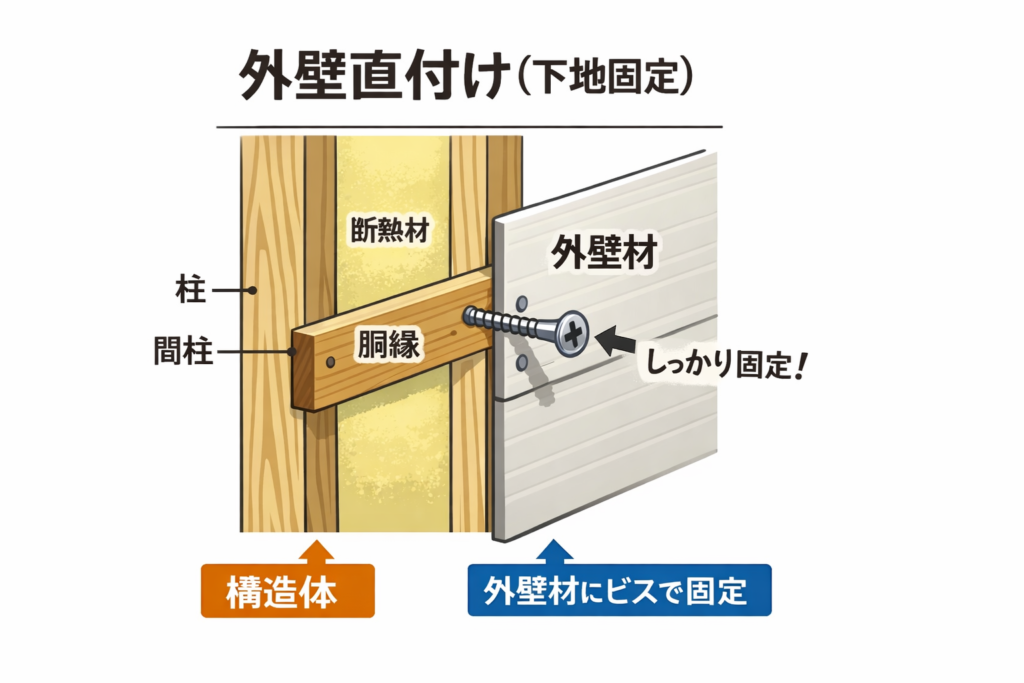 外壁内部の構造躯体(柱・間柱)、および下地材(胴縁)に対し、直接ビスを効かせて確実に固定する工法です。