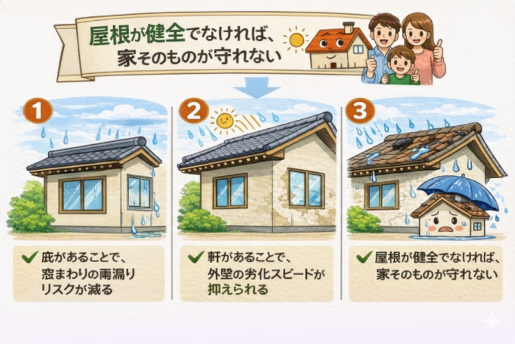 「屋根があれば、庇や軒はいらないのでは?」と思われがちですが、実はそうではありません。
