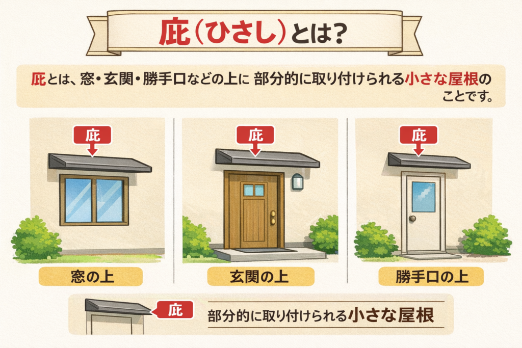 庇とは、窓・玄関・勝手口などの上に部分的に取り付けられる小さな屋根のことです。