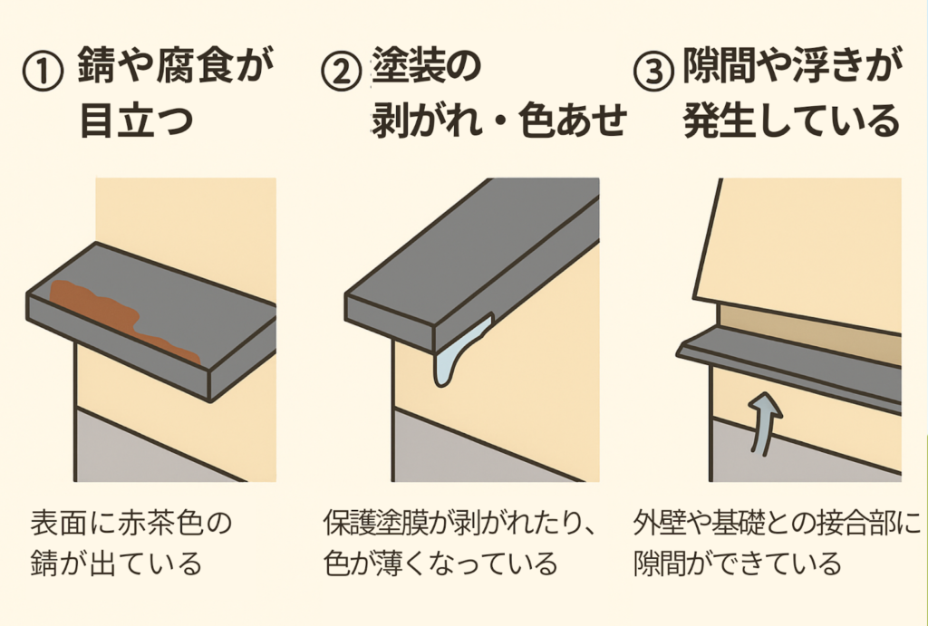 水切りの劣化サインを見逃すと、雨漏りのリスクが高まります。よくある水切りの劣化サインには、以下のようなものがあります。