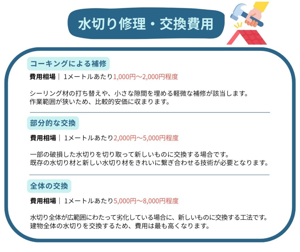 水切りの修理・交換費用は、劣化の度合いや選ぶ工法によって大きく変動します。ここでは、一般的な費用の目安をご紹介します。