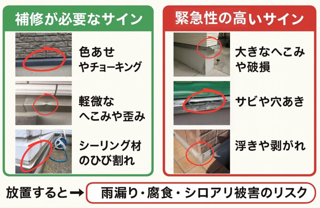 これらのサインを放置すると、雨漏りや外壁・基礎の劣化につながるため、早めの補修や交換が大切です。特に、ひび割れや錆は早期に対処することで、修理費用を抑えることができます。