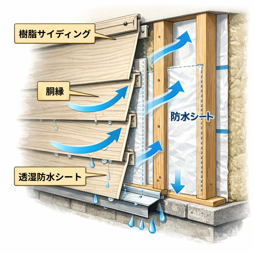 樹脂サイディングの構造上の大きな特徴は、外壁材そのもので雨水を完全に遮断する設計ではないという点です。