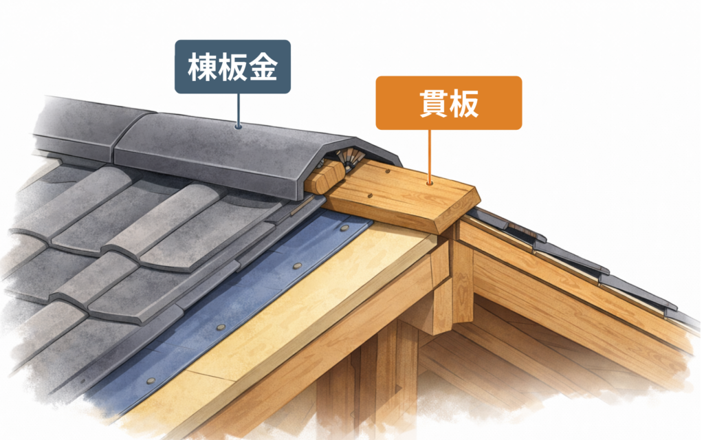 貫板は、普段の生活では目にすることのない部材ですが、屋根の一番高い場所で棟板金を支え、住まい全体を守る重要な役割を担っています。