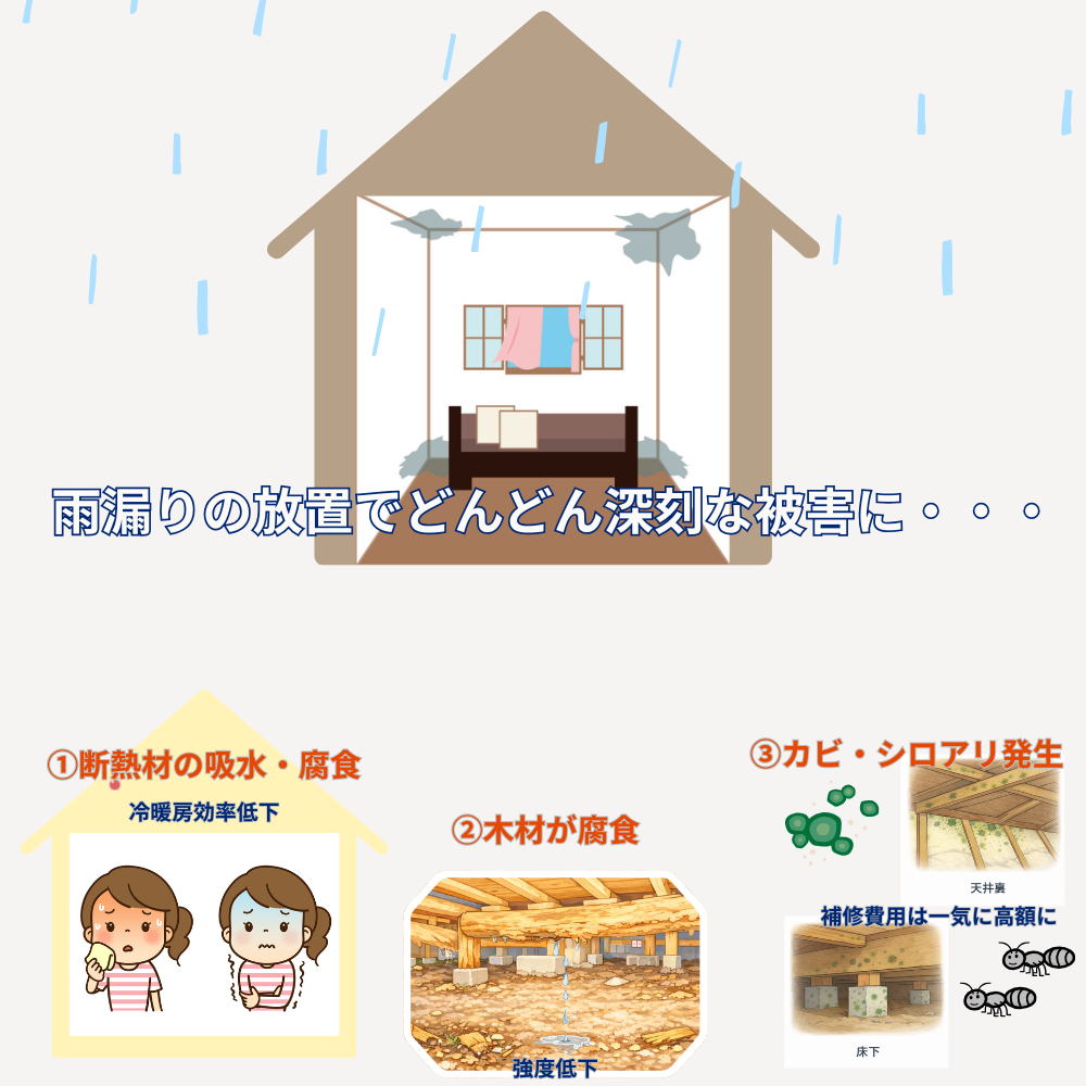 また、湿った木材はシロアリ被害を招きやすく、雨漏りとシロアリが重なると補修費用は一気に高額になります。