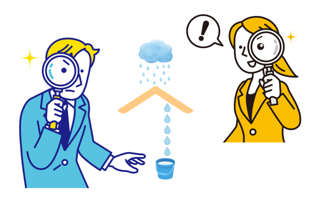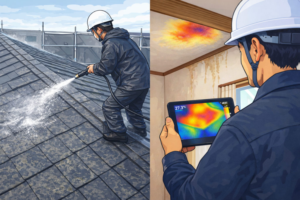 雨漏りの原因が明確な場合は、目視点検のみで判断できることもありますが、再現性が低いケースでは専門的な調査が必要になります。