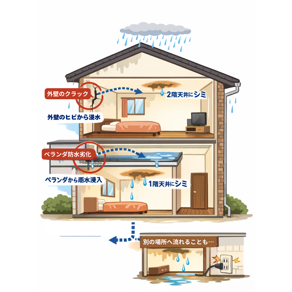 普段は問題なく見える住宅でも、長時間降り続く雨によって、これまで表面化していなかった劣化が一気に現れることがあります。