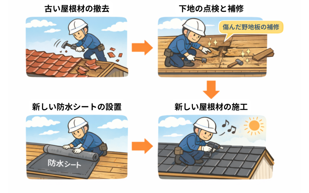 野地板や防水シートまで一新できるため、長期的な耐久性・安心感は最も高い工事といえます。