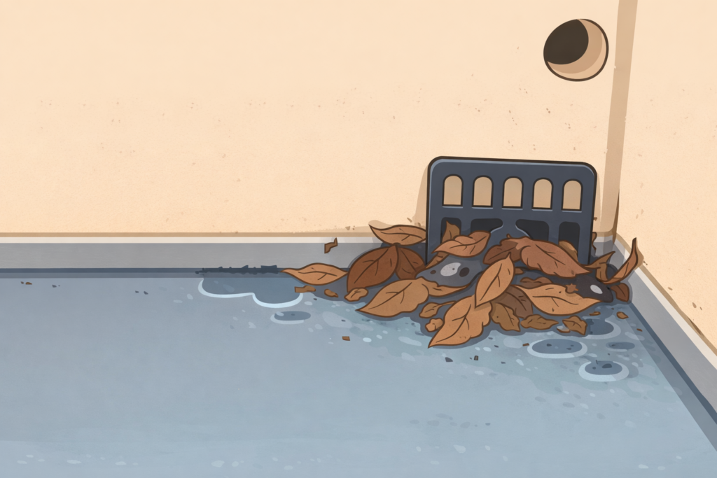 特に排水口の詰まりは防水層に負担をかけ続けるため、定期的な点検と清掃を行うことが重要です。
