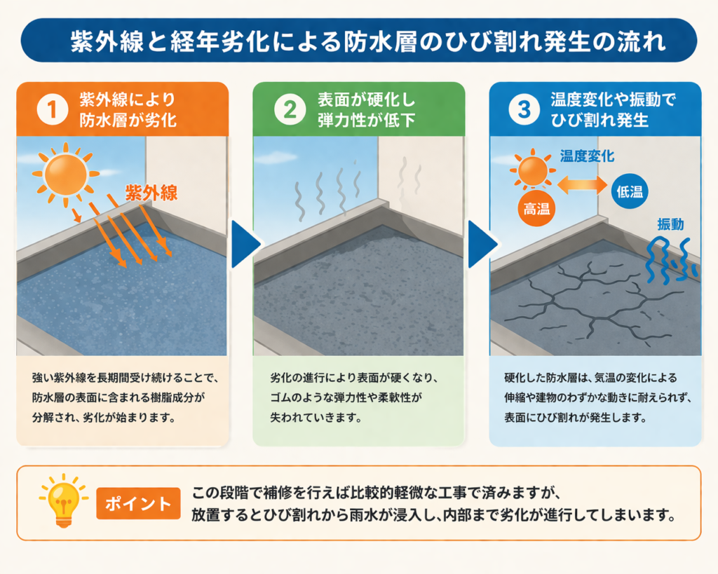 柔軟性が失われた防水層は、わずかな動きや温度変化にも耐えられなくなり、表面にひび割れが発生します。