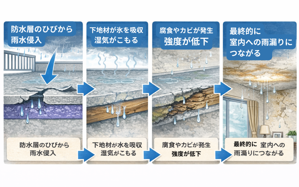 その結果、防水層の全面改修や下地の交換といった大掛かりな工事が必要になるため、早期発見・早期対応が非常に重要です。