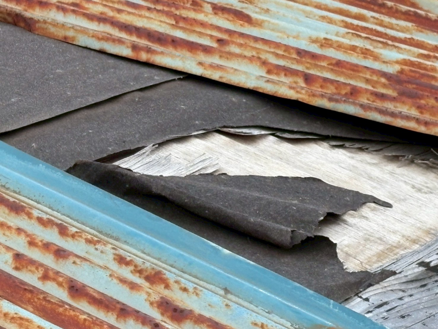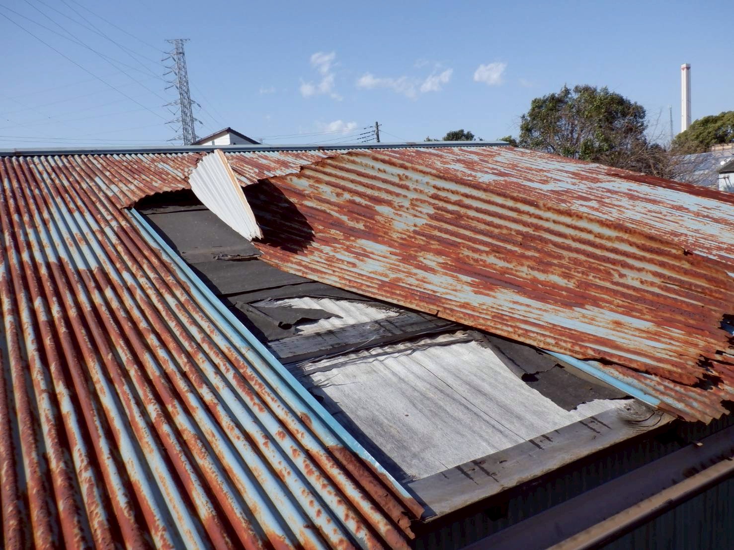 経年劣化により屋根全体のサビが進行し、強風で一部の屋根材が剥がれています。防水機能が失われたことで、雨水が建物内部へ浸入。放置すると屋根だけでなく、建物全体の構造を脅かす雨漏りへと発展します。