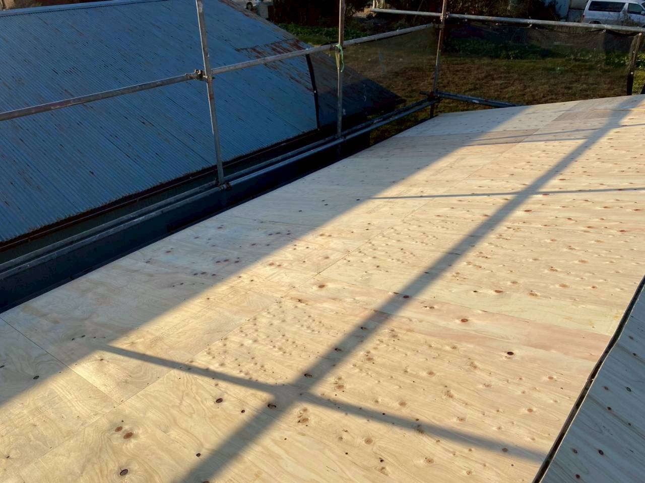 新しい構造用合板(野地板)を隙間なく張り、屋根の強度を劇的に高めます。これにより釘やビスがしっかりと固定され、台風や強風にも耐えられる強固な下地が完成します。